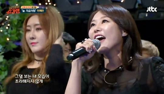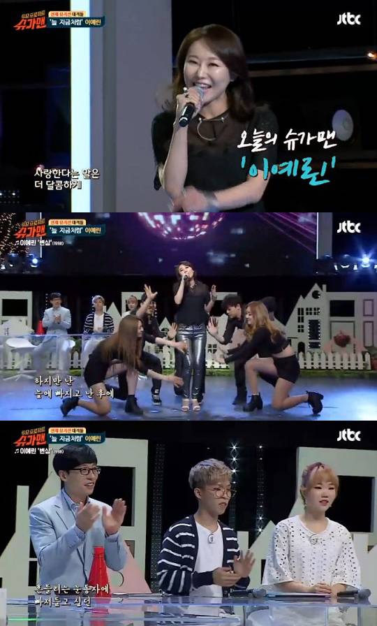 14일 방송된 종합편성채널 JTBC 예능프로그램 ‘투유 프로젝트-슈가맨’에서 유재석팀 슈가맨으로 등장한 이예린은 히트곡 ‘늘 지금처럼’을 부르며 등장했다.