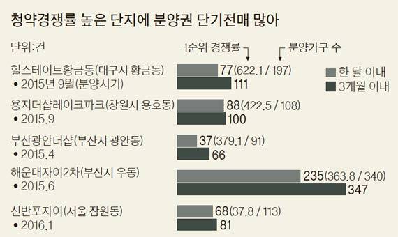 전매제한 규제를 받지 않는 서울·수도권 단지도 비슷하다. 지난 1월 1순위 경쟁률이 37.8대 1이었던 서울 잠원동 신반포자이는 계약이 시작된 2월 한 달간 60%인 68건의 분양권 전매가 이뤄졌다. 서울·수도권에선 6개월 안에 전매할 수 없는데 이 아파트는 전매제한 규제 전에 사업을 시작해 전매가 자유롭다. 전국적으로 한 달에 거래되는 분양권이 전체 물량의 1% 정도인 점을 감안하면 매우 높은 전매율이다. 분양권 단기전매 차익을 노린 청약이 많기 때문이다. 유엔알컨설팅 박상언 대표는 “당첨만 되면 수백만원에서 수천만원의 웃돈을 챙길 수 있다 보니 단기전매가 판을 친다”고 말했다.