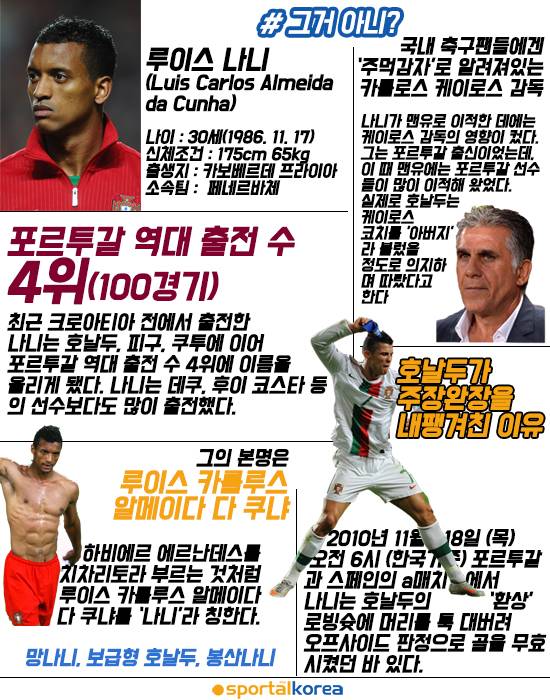나니는 이번 대회서 포르투갈 대표팀의 ‘숨은’ 에이스로 거듭나는 중이다. 많은 이들의 기대가 호날두에게 쏠린 사이에 묵묵히 자신의 진가를 입증하고 있다. 한때 맨체스터 유나이티드 시절 국내 축구팬들로부터 ‘보급형 호날두’라는 애칭을 얻기도 했지만, 기복이 심한 선수라는 오명을 끝내 벗지 못하고 2015년 7월 영국 무대를 떠나야만 했다.