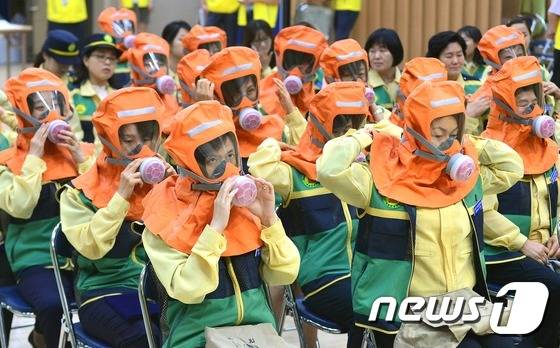 (서울=뉴스1) 민경석 기자 = 1일 오후 서울 서초구청에서 열린 '서초구 여성민방위대 창설 기념식'에서 민방위대원들이 방독면 착용법을 배우고 있다.