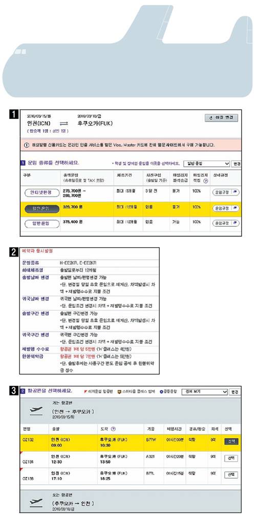 ―백: 화면을 보면 ‘인터넷한정’ ‘할인운임’ ‘일반운임’ 이렇게 세 가지가 뜹니다(사진 ①). 이 세 가지는 환불 수수료 차이와 출발편 변경 가능 여부 때문에 가격이 다른 것입니다(사진 ②). 예를 들어 가장 저렴한 인터넷한정(27만8700원) 항공권의 운임규정을 보면 출발편 예약을 변경하는 것이 불가능합니다. 그것보다 5만 원이 비싼 항공권을 선택하면 필요에 따라 출발편 예약을 변경할 수 있습니다. 또 가장 비싼 항공권인 일반운임(37만8400원)의 경우 환불 수수료(3만 원)가 일단 위의 두 개와 비교해 4만 원 싸고 적립된 마일리지가 있으면 좌석 승급을 할 수 있습니다. 재발행 비용도 4만 원으로 위 두 개와 비교해 1만 원 저렴합니다. 결국 사전에 보험을 드는 셈이지요.