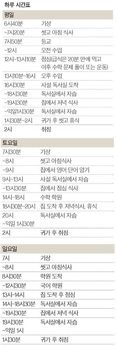 주중에 열심히 공부한 만큼 주말이면 늦잠을 자거나 TV를 시청하며 휴식을 취할 법도 하다. 하지만 김군의 주말 시간표 역시 평일과 다르지 않다. 등교하는 날과 비슷하게 일어나 독서실과 학원을 오가며 공부를 이어간다. 학원에서 배운 내용도 학교 수업과 마찬가지로 그날 바로 복습하고, 과제도 미루지 않는다. 김군은 “경험상 ‘다음에 하겠다’고 한번 미루면 결국 끝까지 못한다”며 “당일 배운 내용만 복습하는 건 사실 공부할 분량도 적고 기억도 잘 나기 때문에 어렵지 않다”고 말했다.