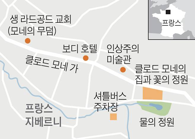 모네의 집을 나와 걷는 한적한 시골길의 이름은 클로드 모네 가(街)다. 지붕과 담장이 낮은 단아한 집들, 잘 다듬은 관목과 봄꽃 냄새가 어우러진 이 길은 여행자에게 걷는 즐거움을 선사한다. 인상주의 미술관과 보디 호텔을 지나 서쪽으로 가면 아담한 규모의 생 라드공드 교회가 나온다. 건물 오른쪽을 돌아 올라가다 보면 십자가가 꽃으로 둘러싸인 가족 묘가 보이고, 가운데 금이 간 대리석 석판에 클로드 모네의 이름이 쓰여 있다. 백내장이 재발한 상태에서 숨을 거두기 직전까지 이 마을에서 '수련'을 그렸던 인상주의 대표 화가의 무덤이 거기에 있었다.