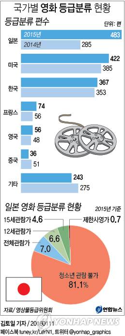 11일 영등위에 따르면 작년에 등급 분류된 영화의 국가별 현황은 일본 483편(28.8%), 미국 422편(25.1%), 한국 367편(21.8%), 프랑스 74편(4.4%), 영국 56편(3.3%), 중국 36편(2.1%) 등이었다.
