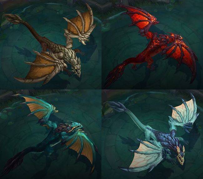 [사진] 왼쪽 위부터 시계 방향으로 대지, 화염, 바람, 바다 드래곤. /리그오브레전드 공식 홈페이지 캡처.