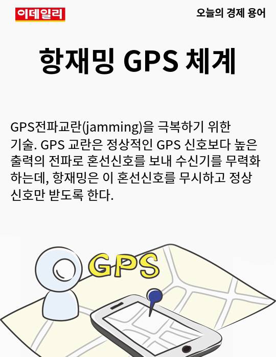 [이데일리 e뉴스 유수정 기자] *GPS전파교란(jamming)을 극복하기 위한 기술. GPS 교란은 정상적인 GPS 신호보다 높은 출력의 전파로 혼선신호를 보내 수신기를 무력화하는데, 항재밍은 이 혼선신호를 무시하고 정상 신호만 받도록 한다.