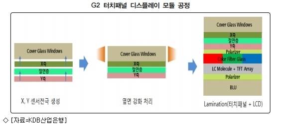 G2(OGD, One Glass Solution)는 별도의 센서층이 없이 커버글래스에 직접 전극을 형성하는 일체형 구조를 말한다. 글래스·필름 기판이 필요 없는 만큼 높은 광학성능을 제공하지만, 커버글래스에 전극이 형성되기 때문에 커버글래스 파손 시 터치센서가 동작하지 못하는 단점이 있다.