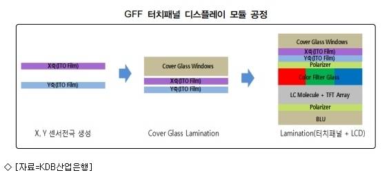 GFF(Glass Film Film)은 커버글래스와 디스플레이 패널 사이에 2장의 필름(PET Film)을 삽입하는 외장형 방식을 말한다. PET 필름에 인듐주석산화물(ITO) 전극이 형성된다. 공정난이도가 낮아 대부분의 터치 스크린 업체들이 이 방식을 채택, 양산하고 있다.