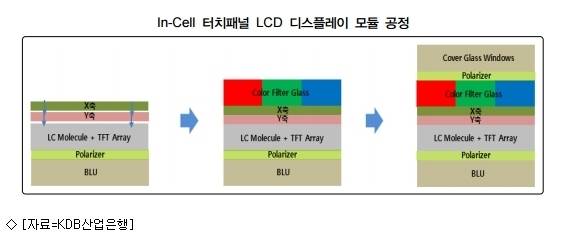 인셀은 디스플레이 패널 내부(TFT 기판)에 터치센서를 형성하는 방식을 말한다. 액정표시장치(LCD) 디스플레이의 백플레인 제작 시, 터치센서를 제작하는 형태다. 터치센서를 위한 별도의 기판이 필요하지 않은 덕분에 얇고 가벼운 장점을 제공한다.