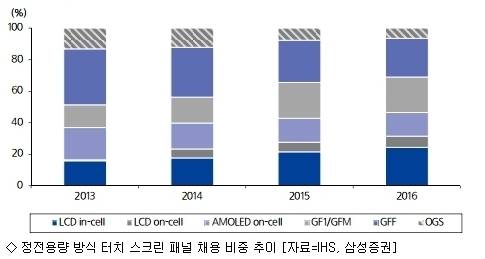 유기발광다이오드(OLED) 디스플레이의 경우, 온셀 방식은 봉지유리 기판에 터치 센서를 형성하는 만큼 두께·무게·투과율·가격경쟁력을 확보할 수 있는 장점을 제공한다.
