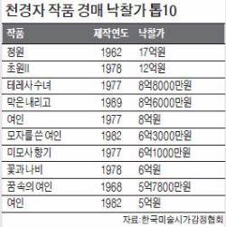 1970년대 점당 200만~1000만원에 거래되던 천 화백의 작품은 현재 작품성과 크기에 따라 2억~10억원대를 호가한다. 40여년 만에 100배 이상으로 오른 것이다. 작년 7월에는 ‘테레사 수녀’가 8억8000만원에 낙찰된 데 이어 미국 수집가가 오래 소장한 미인도 ‘막은 내리고’(8억6000만원), ‘모자를 쓴 여인’(6억3000만원), ‘미모사 향기’(6억1000만원), 꽃과 나비(6억원) 등도 억대 작품 대열에 합류했다. 매매는 되지 않지만 천 화백이 1998년 서울시립미술관에 기증한 작품 93점 가운데 ‘생태’(51×87㎝) ‘나의 슬픈 전설의 22페이지’(43×36㎝) ‘여인의 시’(59.5×47㎝) 등 20여점은 점당 20억원을 넘을 것이란 추정이다.
