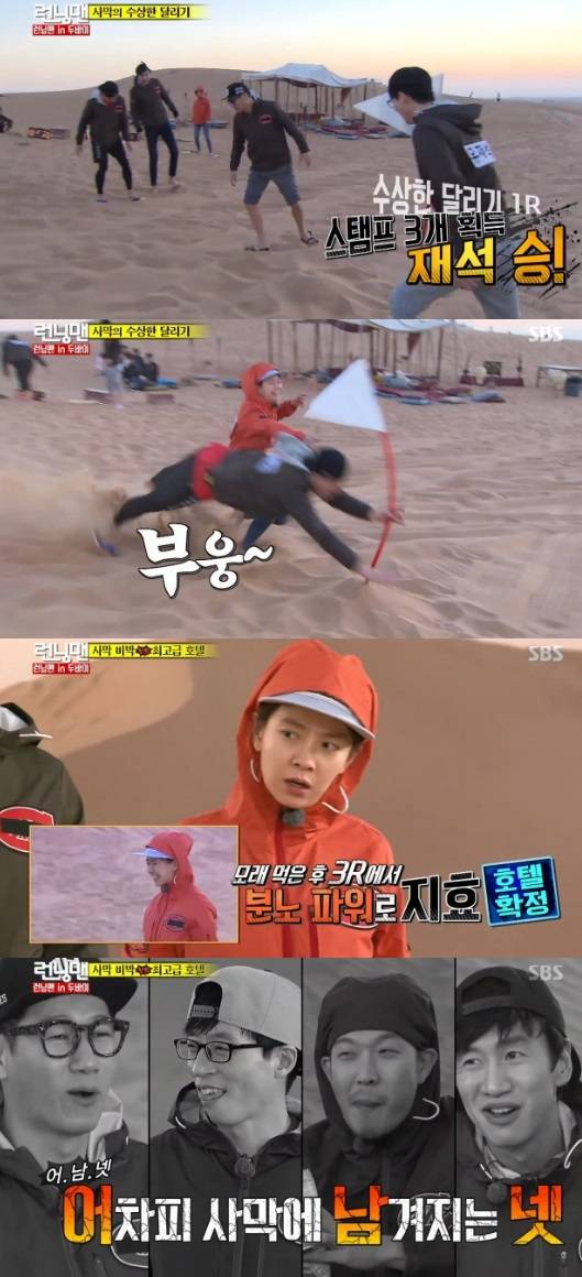 하지만 하위권 4명은 바로 사막 비박을 하게 된다고 하자 하하, 유재석, 이광수, 지석진4인방은 "사막 모여라 사막"이라며 미션 전부터 포기해 웃음을 안겼다.