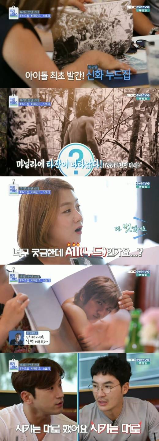 또 박나래는 과거 신화의 세미누드집을 꺼내 들었고, 이민우는 "마닐라에서 찍었다. 다 벗고 스텝들은 한쪽에 가 있었다"며 "내 개인 누드 컷은 바지만 살짝 내린 거다. 시키는 대로 했다"고 밝혔다.