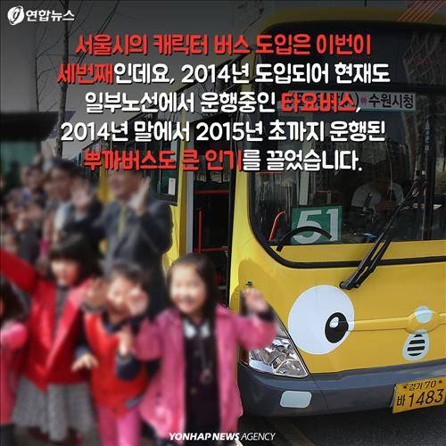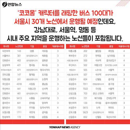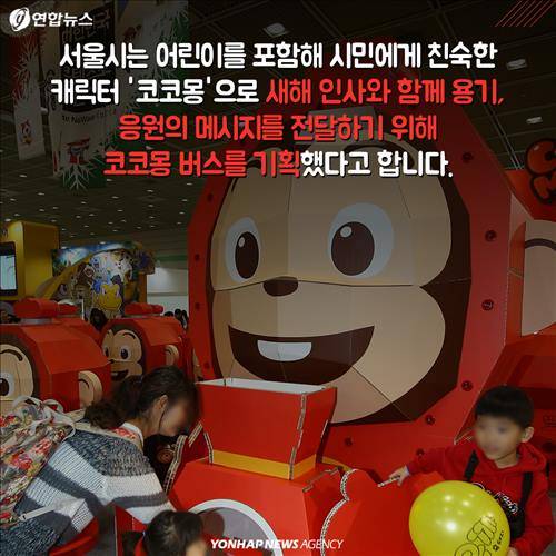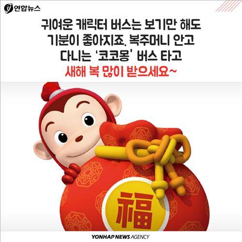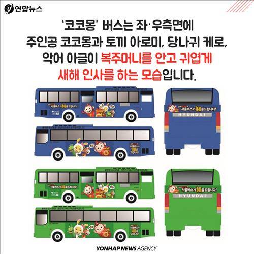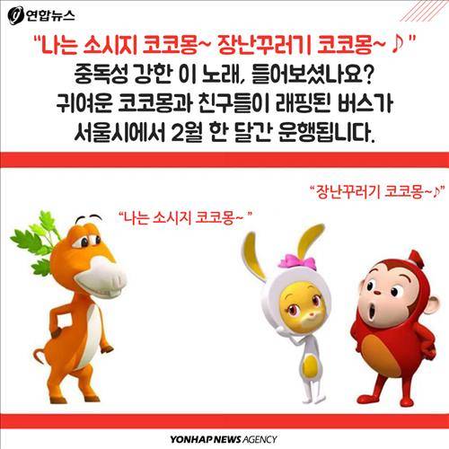 (서울=연합뉴스) 전승엽 기자ㆍ김지원 작가ㆍ강현우 인턴기자 = '코코몽' 캐릭터를 래핑한 버스 100대를 2월 한 달간 30개 서울시내 노선에서 운행합니다. 붉은색 소시지 원숭이 캐릭터가 등장하는 '코코몽'은 2008년 선보인 이래 어린이들에게 큰 인기를 얻으며 시즌 3까지 방영된 국산 애니메이션입니다.