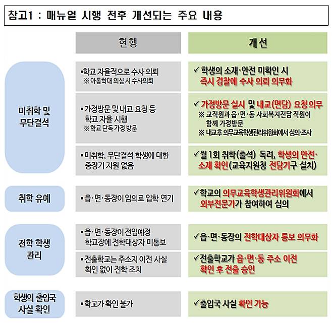 교육부는 이를 통해 초등학생인 아들을 폭행해 사망에 이르게 하고 사체를 훼손한 '부천 초등생 토막사건', 아버지에게 폭행당해 숨진 채 방치된 '부천 여중생 학대 사망' 사건, 어머니의 폭행으로 숨진 후 유기된 '용인 암매장 여아' 사건 등 최근 잇따르는 아동 학대와 무단결석 학생 문제에 적극 대응하겠다는 뜻을 밝혔다.
