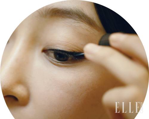 펜슬 또는 젤 타입의 아이라이너로 눈 앞머리를 제외한 눈동자 바로 위의 점막을 채워 눈동자가 커 보이는 서클 효과를 준다. 그 다음 끝이 단단하고 납작한 마커 타입 아이라이너로 눈초리 끝에 사각형을 그린다. 착해 보이도록 끝을 살짝 내리되 사각형이 언더라인보다 아래로 내려가지 않도록 주의하길. 눈초리가 너무 처지면 금방이라도 울 것 같은 ‘울상’ 눈매가 될 수 있으니까!