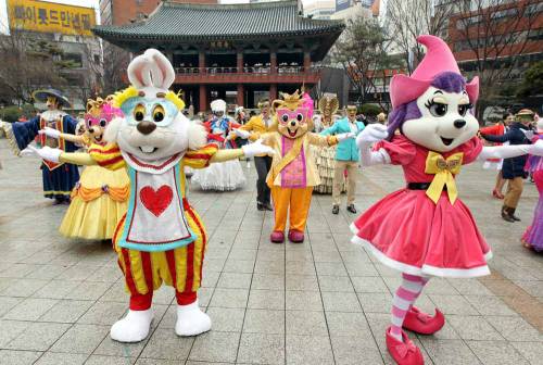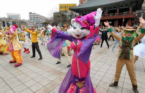 13일, 오전 롯데월드 어드벤처가 캐릭터 ‘샤론캣’과 80여명의 연기자들이 화려한 봄 축제의 시작을 알리기 위해 ‘샤론캣의 시크릿 플래시몹’ 이벤트를 보신각 광장에서 진행하고 있다.