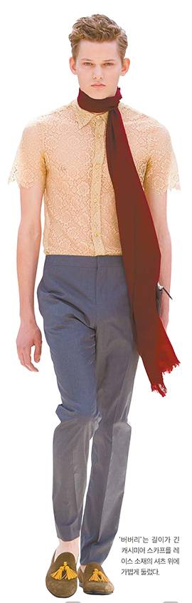 넥타이가 꽉 잡고 있던 남성의 목 선에도 부드러운 스카프의 매력이 녹아들었다. 지난 시즌엔 ‘랙 앤 본’, ‘살바토레 페라가모’ 등 많은 패션 브랜드에서 어깨를 덮을 정도의 오버사이즈 스카프를 선보였지만 올 시즌엔 길어지고 가벼워진 스카프가 자리를 대신 했다. 산뜻한 소재의 테일러드 재킷에 화려한 패턴의 스카프를 살짝 두르면 금세 봄의 기운이 물씬 풍긴다. 프랑스 패션 브랜드 ‘에르메스’는 일반 스카프 크기(90㎝х90㎝)보다 작은 크기(65㎝х65㎝)의 스카프를 넉넉하게 재단된 가죽 재킷에 캐주얼하게 묶어 연출했다. 가벼운 면 소재 재킷에 스카프를 둘러매 편안한 느낌을 내기도 했다. 화려한 패턴의 실크 스카프는 평소 입는 일상복에 센스를 더할 수 있는 포인트 아이템이다.