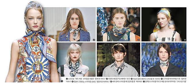 스카프는 목에 감아 체온도 유지하고 멋도 내는 패션 소품으로 특히 쌀쌀함이 채 가시지 않은 초봄에 제 몫을 톡톡히 한다. 목에 두르기도 하지만 두건처럼 머리에 쓰기도 하고 벨트 대신 허리에 두르기도 한다. 지난해부터 1970년대 복고풍 패션인 ‘레트로(Retro)’ 트렌드가 이어지고 있는 만큼 스카프는 이번 시즌 패션쇼에서도 다양한 모습으로 등장했다. 지난 시즌 여성복 컬렉션에선 블랙 앤 화이트 컬러의 단조로운 스키니 스카프가, 남성복 컬렉션에선 묵직하게 어깨를 휘감는 오버 사이즈 스카프가 대세였다. 하지만 이번 시즌엔 포근한 계절에 맞게 가볍고 다채로운 디자인의 스카프가 등장했다. 디자인과 색상이 다채로워진 만큼 스카프로 연출할 수 있는 스타일의 범위도 넓어졌다.