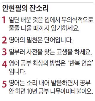 '영어실력기초' 서문의 '주의 사항'은 이렇게 시작한다. 책을 읽는 내내 시시콜콜한 잔소리가 계속돼 마치 선생님이 옆에 붙어 있는 것 같은 효과를 준다. 안현필의 잔소리는 이렇게 이어진다. "일단 배운 것은 입에서 무의식적으로 줄줄 나올 때까지 암기하세요." "영어의 밑천은 단어입니다. 단어 공부를 70%, 문법 공부를 30%로 해야 합니다."