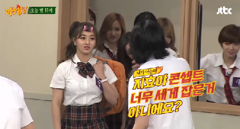 이 모습을 본 김희철은 웃음을 참지 못하며 "지효야 콘셉트 너무 세게 잡은 거 아니예요?"라고 물어보았다.