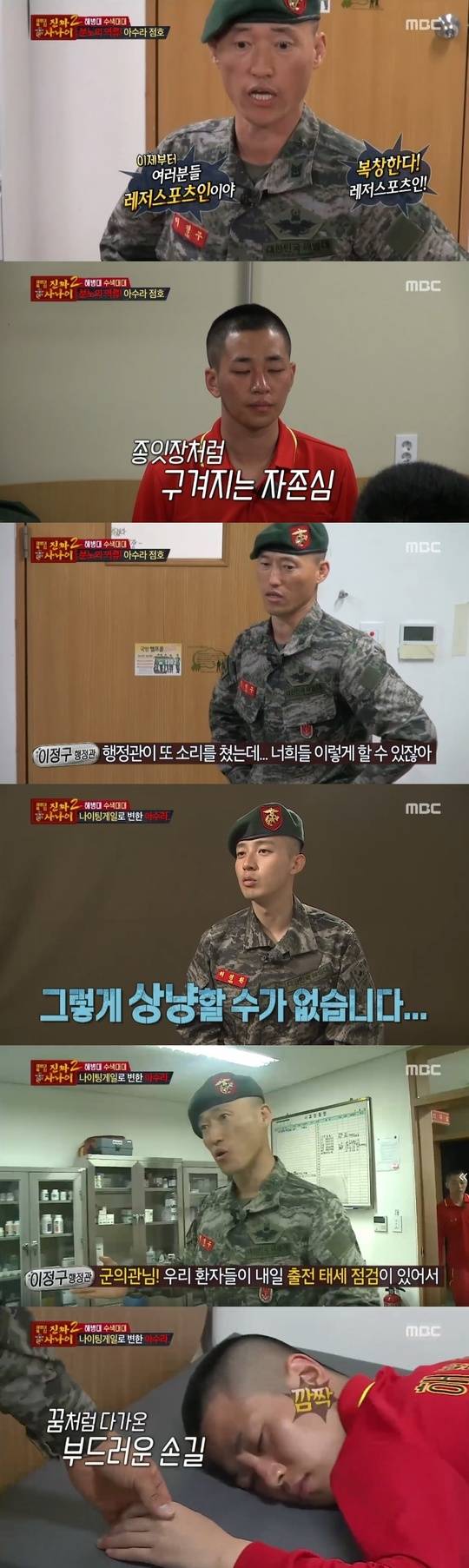 마냥 분노하는 모습만 보여준 것도 아니었다. 잠깐의 정비 시간을 준 뒤 생활관으로 돌아온 아수라 교관이 돌연 따뜻해진 모습으로 멤버들을 당황케 한 것. 아수라 교관은 "요 개구쟁이들. 행정관이 자꾸 너희들을 다그쳐 마음이 안 좋다. 행정관도 여러분처럼 병이 있다. 아프다. 해병"이라며 웃는가 하면 허경환과 동준, 줄리엔강, 딘딘을 의무실로 데려가 건강 상태를 진단받을 수 있게 하는 배려를 보였다. 아수라 교관은 군의관에게 "우리 환자들이 내일 출전 태세 점검이 있다"고 말했다.
