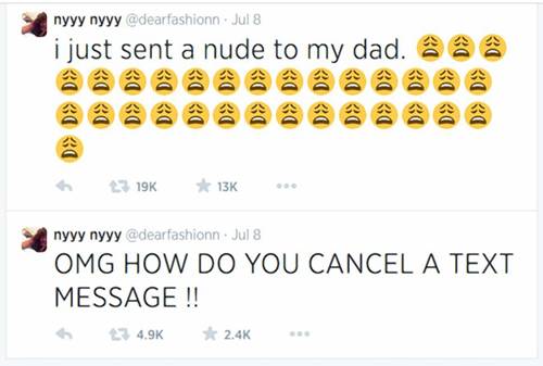 이어 그는 우는 표정의 이모티콘 수십 개와 함께 “방금 아버지에게 누드 사진을 보냈다”는 트윗으로 질문을 하는 이유를 밝혔다.