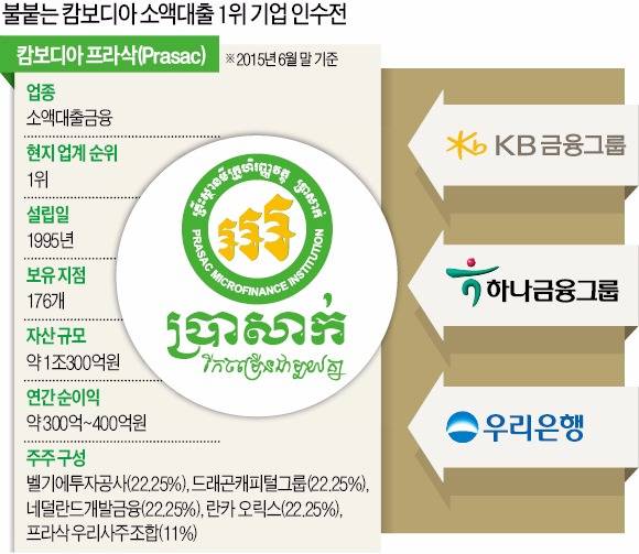 KB금융·하나금융·우리은행이 캄보디아 1위 소액대출회사인 ‘프라삭(Prasac)’ 인수를 놓고 경쟁을 벌이고 있다. 국내 대형 은행 세 곳이 동시에 해외 금융회사 인수전에 뛰어든 것은 전례 없는 일로, 해외시장 진출에 공을 들이는 금융회사들의 최근 분위기를 그대로 보여준다는 게 금융권 분석이다.