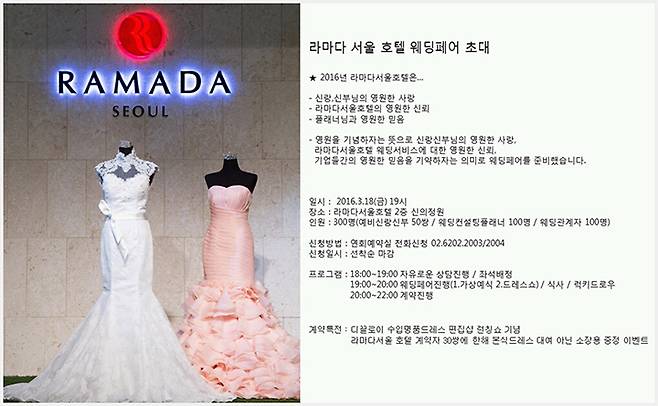 2016년 결혼시즌을 맞이하여 라마다서울호텔에서 개최되는 웨딩박람회 행사인 '웨딩페어 초대전'은 가상예식, 드레스쇼, 식사, 럭키드로우, 웨딩드레스 증정이벤트 등 다양한 행사가 진행될 예정이며 일정은 아래와 같다.