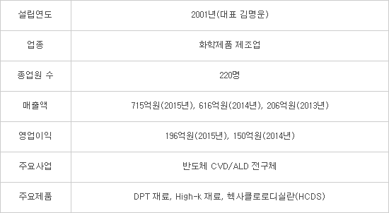 하이-k 전구체는 D램 캐패시터 유전막을 만드는데 쓰인다. k는 유전율을 일컬으며, 하이-k는 유전율이 다소 높은 물질을 말한다. 2013년 하반기부터 이 제품의 매출이 발생했다.