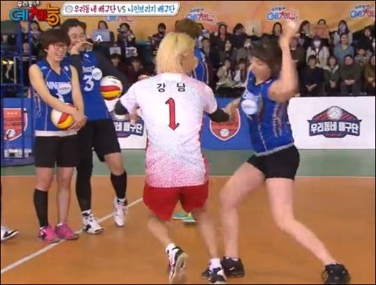 어머니 배구단 주장은 강남에게 "너 어디갔다 이제 왔니? 누가 머리 노란색으로 염색하라고 했어?"라고 다그쳤다. 강남이 어머니 말을 안 듣고 딴청을 피우자 어머니는 강남의 등을 잡고 스파이크를 날렸다. 강남은 극심한 고통을 호소해 웃음을 자아냈다.