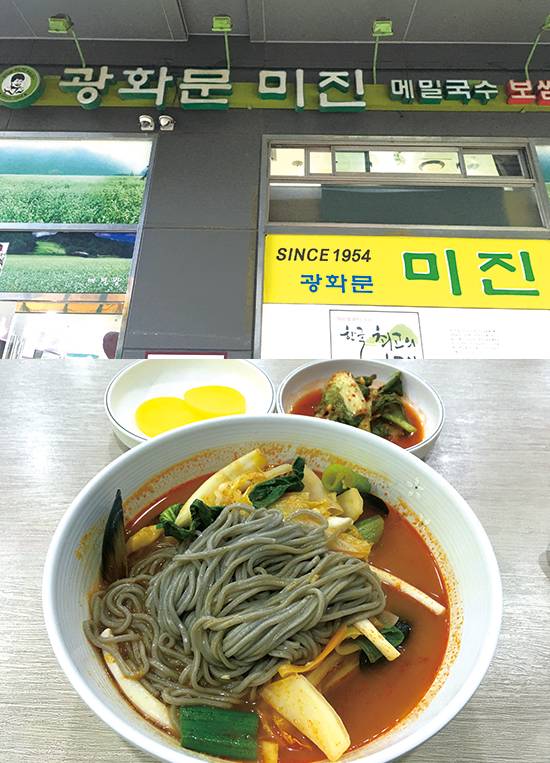1954년에 문을 연 집이다. 60년도 넘었다. 그 세월 변함없이 만들어 손님에게 내놓은 음식이 메밀국수와 보쌈이다. 대표 메뉴는 역시 냉메밀국수다. 모밀 소스 재료와 모밀을 테이블에 올려주면 손님이 직접, 갈은 무, 김, 송송파, 와사비 등을 육수에 적당히 넣어 제조해야 한다. 사실 건장한 남자라면 젓가락질 대여섯 번 하면 뚝딱 끝날 양이다. 그래서 메밀국수는 조금씩 말아 천천히 육수에 적셔 먹어야 영양과 맛이 제대로 흡입된다. 추운 겨울에는 온메밀 인기도 좋다. 온메밀은 어묵이 듬뿍 들어간 일종의 우동이다. 추위에 칼칼해진 입맛이 돌아오고 몸이 후끈해지는 메뉴다. 최근에는 짬뽕메밀면도 등장했다. 국물은 맵고 면은 부드러운, 부조화 속의 조화로움이라고나 할까? 이밖에 비빔메밀, 우동, 비빔밥, 만두, 메밀전병 등을 1만원 미만에 맛볼 수 있다.