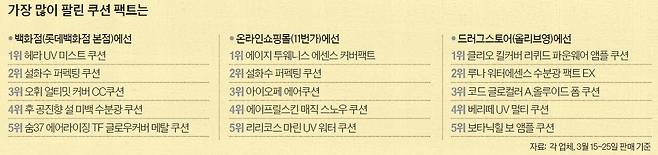 국내 첫 쿠션 팩트 제품은 2008년 나온 아모레 퍼시픽의 ‘아이오페’다. 그 후 각 회사에서는 ‘퍼펙팅 쿠션’ ‘미스트 쿠션’ ‘CC쿠션’ ‘마린콜라겐 쿠션’ 등을 잇달아 내놓았다. 아이오페는 지난해까지 8000만 개의 쿠션을 판매했다.