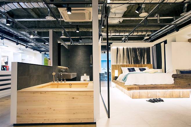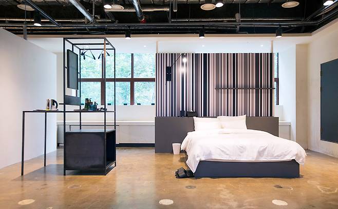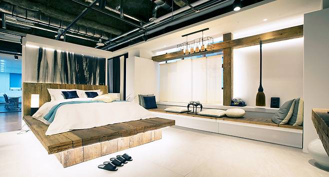바로 옆에는 한옥의 대청마루에서 모티브를 얻은 객실이 있었다. 정 매니저는 “대청마루 위에 올려둔 매트리스, 삼베 직물로 만든 침구·커튼, 다기(茶器) 같은 소품이 내국인은 물론 외국인 관광객의 흥미를 끌 수 있다”고 설명했다. 지방 출장 때 모텔을 자주 이용한다던 한 중년 남성이 객실을 둘러보며 “요즘엔 이런 모텔도 있느냐”며 놀라워했다.