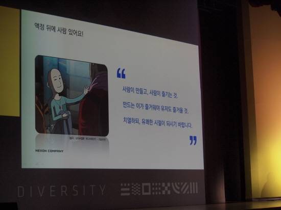 인디의 멘탈리티에 대한 발표가 이어졌다. 게임을 출시하고 나면 언제나 좋은 반응만을 얻을 수 없다. 욕설 가득한 리뷰를 보며 회의를 겪기도 했단다. 점차 시간이 지나며 겸허히 수용하고 대응하다 좋은 리뷰를 보고 감동을 받았던 일화도 있었다고 한다. 이런 과정을 거치며 이 이사는 '성의 있게 대응하는 자세를 보이자'는 교훈을 얻었다고 한다.