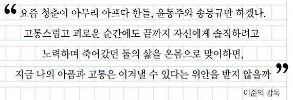 그럼에도 “80쪽 남짓한 시나리오가 대체 뭐라고 돌덩이처럼 무겁게 느껴질” 때면 그는 윤동주의 유고 시집 『하늘과 바람과 별과 시』를 몇 번이고 다시 읽었다.