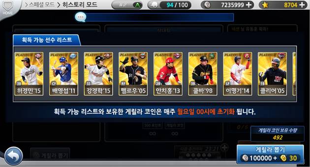 특히 '히스토리 모드'를 통해 과거 프로야구의 슈퍼스타들을 손 안에서 만날 수 있다. '히스토리 모드'는 매일 24시간 동안 등장하는 '요일 팀'과 특정 시간에만 등장하는 '게릴라팀'과의 대결로 나뉜다.