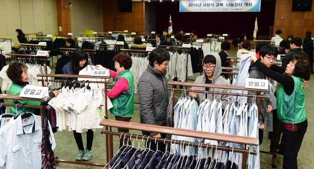 금천구청 대강당에서 12일 열린 '2016 사랑의 교복나눔 장터'에서 학생들이 교복을 고르고 있다.