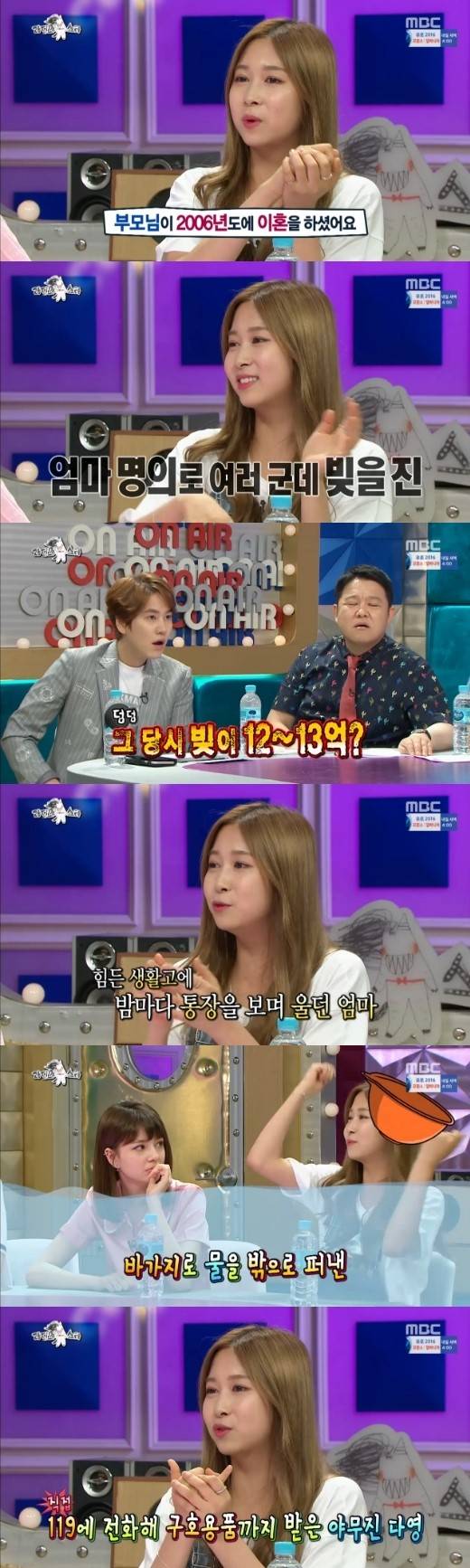 우주소녀 다영은 “부모님이 2006년도에 이혼 하셨다. 아버지가 빚을 되게 많이 졌는데 엄마 이름으로 해놓고 아빠가 서울로 가겠다 그래서 이혼을 했다. 그 때 빚이 12억인가 13억 그 정도 있었다”고 말했다.