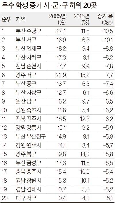 ② 떠오른 수능 명문, 풍산·양서·세마고 중앙일보는 지역별·학교별 학력의 변화 추이를 살펴보기 위해 2005~2015학년도 수능 성적 원자료를 분석했다. 특히 수능 국 ·수 ·영 영역의 2등급 이내 학생 평균 비율을 구했다. 상위 11%를 의미하는 2등급은 서울 소재 주요 대학들이 수시 모집 합격을 위한 최저 등급으로 설정하는 기준이다.