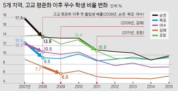 평준화 제도를 도입한 다른 지역도 마찬가지다. 수능 성적 분석 결과 2005~2015년 고교 평준화로 전환한 순천·목포·여수(이상 2005년)·김해(2006년)·포항(2008년) 등 5개 지역 모두 우수 학생 비율이 평준화 시점을 기점으로 급격히 줄었다. 목포의 경우 2007년 수능에서 우수 학생이 12.5%였다가 이듬해 9.5%로 떨어졌다. 여수도 같은 기간 12.3%에서 10.5%로 우수 학생이 줄었다. 김해·포항도 평준화 전환 후 고교에 입학한 학생이 수능을 치른 첫해에 성적 하락을 경험했다.