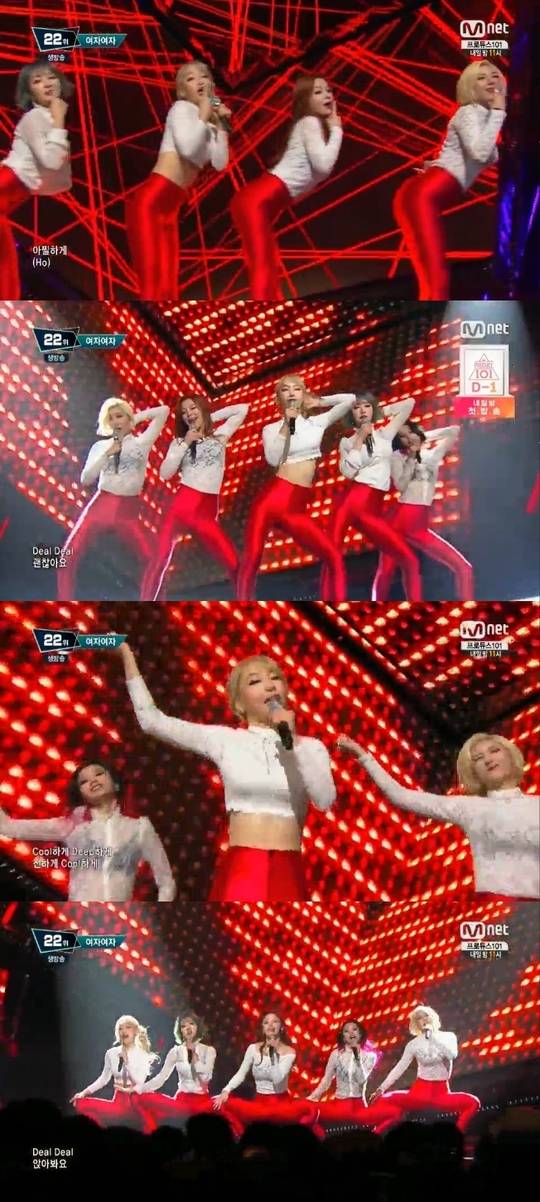 이날 여자여자는 속옷이 비치는 시스루 상의에 빨간 스키니 하의를 매치해, 더 강렬한 섹시미를 드러냈다.