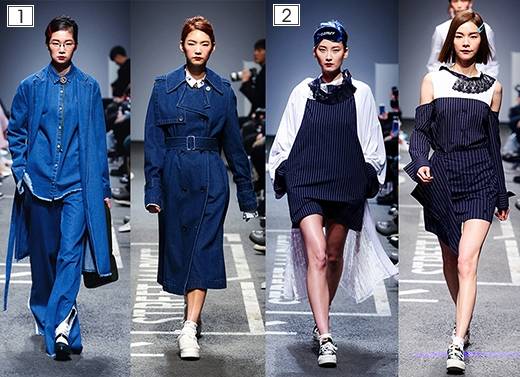 홍혜진 쇼의 경우 시밀러룩을 아주 세련되게 풀어냈는데, 중청에 매니쉬한 디자인의 트렌치코트와 허리벨트로 여성스러운 라인을 드러낸 진청 트렌치코트로 눈길을 끌었다.