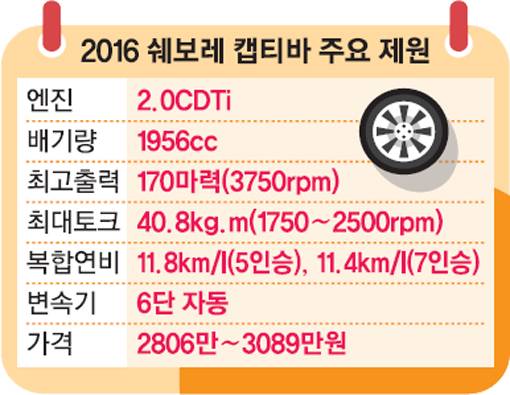 | 쉐보레가 21일 출시한 2016 캡티바는 최근 유행하는 크로스오버가 아닌 강인함을 강조한 정통 SUV 스타일로 차별화했다. 부드럽고 조용한 파워트레인, 후륜 서스펜션이 주는 승차감, 뛰어난 가속성능, 공간 활용성을 자랑한다. 사진제공|한국지엠 |