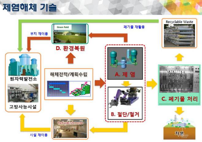 원전 해체 핵심은 바로 ‘제염 기술’이다. 제염은 원전 해체 전후에 원자로 내외부 방사능 오염 물질을 제거 또는 저감시키는 것이다. 원자력발전소를 가동할 때 노수 순환계통장치와 기기에서 발생하는 방사성물질을 닦아내는 기술이다. 넓게는 방사능에 오염된 인체와 장치, 실내외 시설 등 방사성 물질을 제거하는 것을 모두 포함한다. 제염은 물리적, 화학적, 전기화학적 방법을 사용한다.