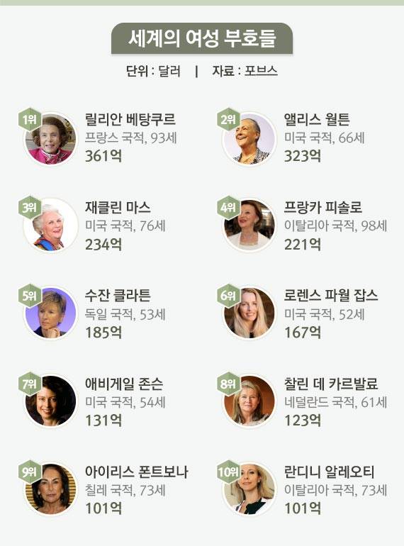 아, 세계의 여성 부호가 누군지 궁금하시다고요? 아래 표를 참고하세요.