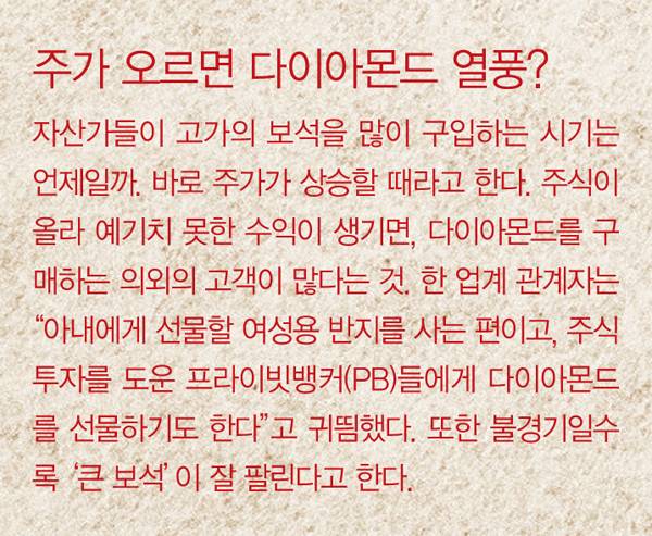 자산가들이 고가의 보석을 많이 구입하는 시기는 언제일까. 바로 주가가 상승할 때라고 한다. 주식이 올라 예기치 못한 수익이 생기면, 다이아몬드를 구매하는 의외의 고객이 많다는 것. 한 업계 관계자는 “아내에게 선물할 여성용 반지를 사는 편이고, 주식투자를 도운 프라이빗뱅커(PB)들에게 다이아몬드를 선물하기도 한다”고 귀띔했다. 또한 불경기일수록 ‘큰 보석’이 잘 팔린다고 한다.
