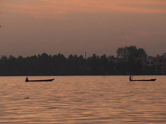 부지런한 어부들은 배를 타고 강 깊은 곳으로 들어가고 있다. 여명 속을 헤쳐가는 어부들의 모습은 삶에 기운을 주는 풍경이다.