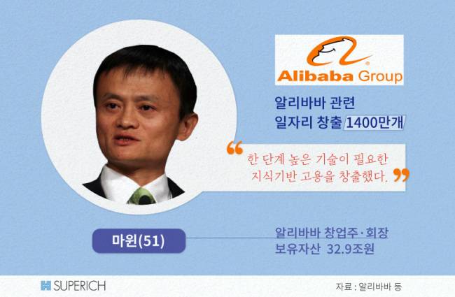 22일 기준 32조9000억원(275억달러)을 거머쥔 그는 기회 있을 때마다 고용창출을 강조합니다. 마 회장은 지난해 5월 방한 당시에도 “알리바바는 중국에서 추가고용 1400만개를 만들었다. 수준 높은 기술이 필요한 지식기반 일자리들”이라고 밝혔습니다.