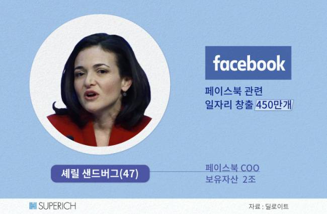 샌드버그의 주장을 뒷받침하는 숫자가 있습니다. 페이스북이 글로벌 컨설팅기관 딜로이트에 의뢰해 분석한 것인데요. 이 회사가 구축한 사회관계망서비스(SNS)는 2014년 기준 450만개 일자리를 새로 만든 것으로 나타났습니다. 산출된 일자리 수는 페이스북 직원(8000명ㆍ2014 기준)을 뺀 것입니다.
